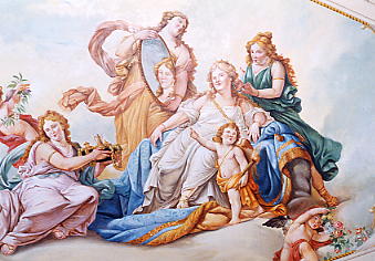Scena di una vasta decorazione realizzata interamente sul soffitto che raffigura la storia di Venere. Nella foto viene messo in risalto il rito della toilette della dea.
